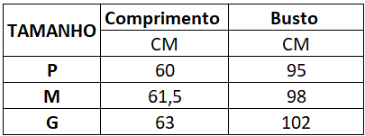 OBS: As medidas podem variar em até 3 cm em razão da costura.