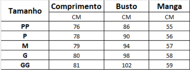 OBS: As medidas podem variar em até 3 cm em razão da costura.